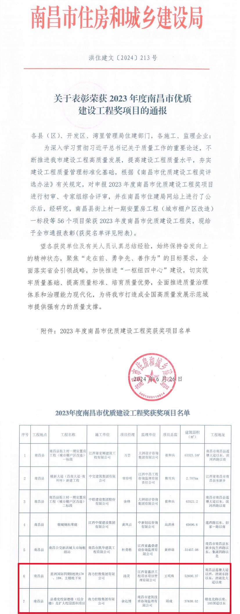 近日,南昌市住房和城乡建设局发布了《关于表彰荣获2023年度南昌市优质建设工程奖项目的通报》,由海力控股集团承建的星洲国际四期B地块17#、18#、主楼地下室项目和县委党校崇德楼(综合楼)及扩大校园面积项目荣获 “2023年南昌市优质建设工程奖”。