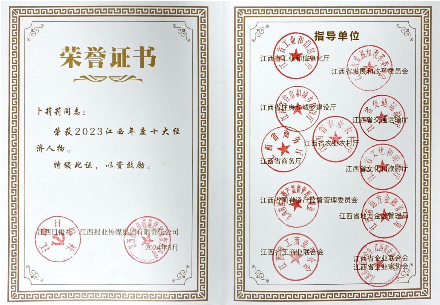 5月9日,2023江西年度十件经济大事、十大经济人物、领军企业发布仪式在南昌举行。江西省委常委、省委宣传部部长卢小青,省政府副省长夏文勇出席活动,并为2023江西年度十大经济人物颁奖。海力控股集团董事长卜莉莉获评“2023江西年度十大经济人物”,应邀参加发布会并登台接受表彰。