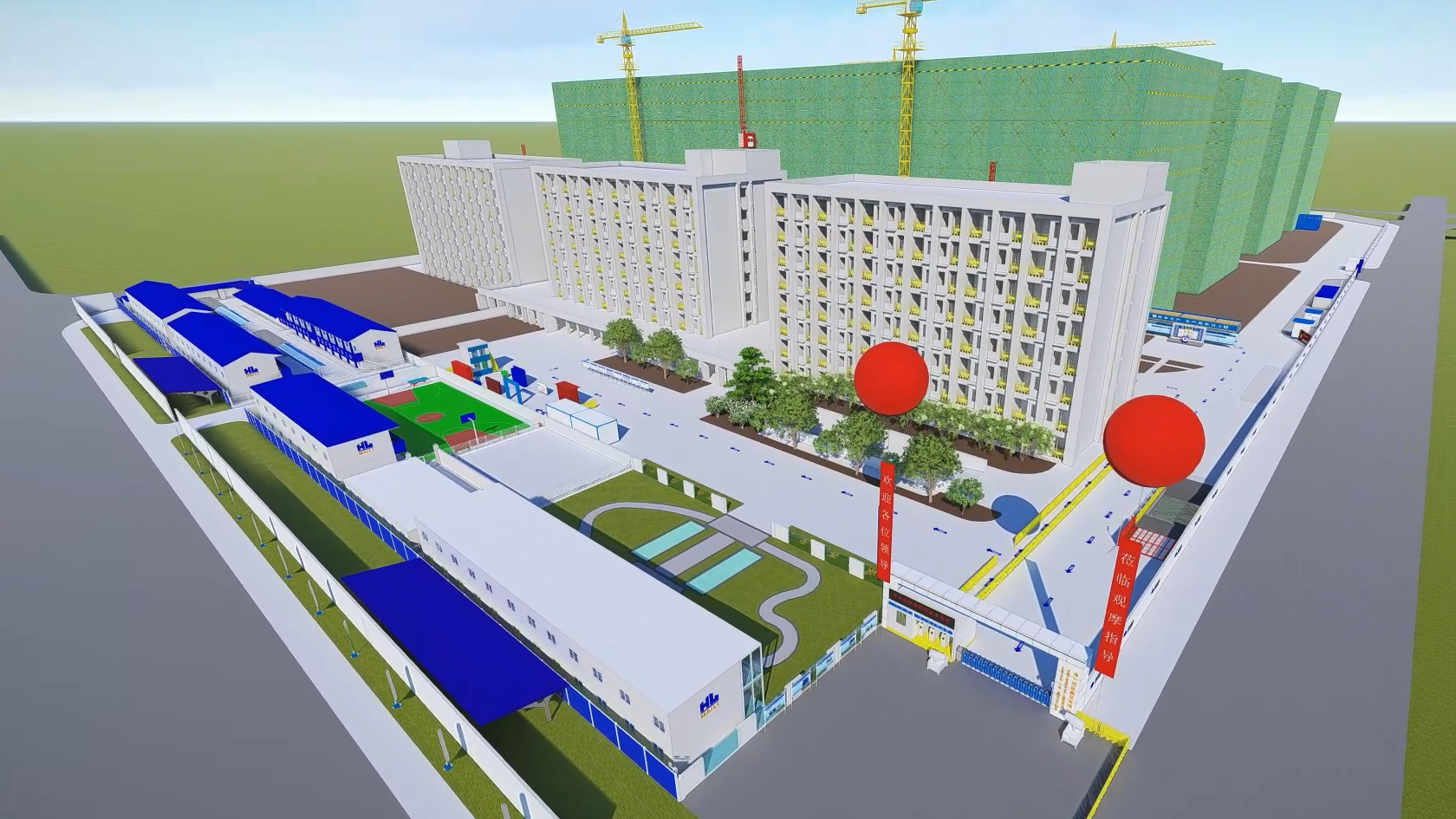 现场防护设施大量采用新型可周转定型化产品,包括工具式防护栏杆、定型化钢筋防护棚等;宿舍楼单体采用花蓝+冲孔板安全网外架,在保证施工安全的同时,实现了外架搭设的规范化与美观化;厂房首层高支模采用盘扣钢管支撑架,不仅提升了支撑系统稳定性,还使材料周转率提高40%。
