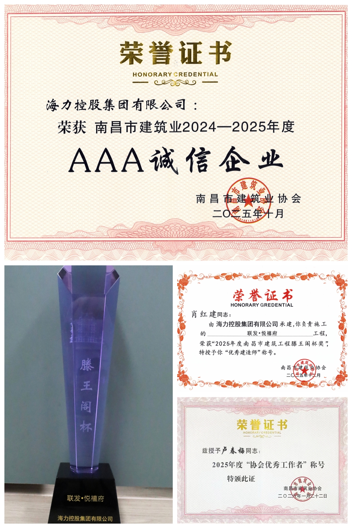 会上宣读了《关于对2025年度“南昌市优质建筑工程滕王阁杯”达标评价项目表彰的决定》《关于公布2024—2025年度南昌市建筑业“信用企业”评价结果的通知》《关于表彰2025年度全市工程建设质量管理小组竞赛活动成果的决定》《2025年度协会优秀工作者》等文件,并举行了隆重的颁奖仪式。凭借在诚信经营、工程品质与行业服务方面的突出表现,海力控股集团收获多项荣誉:集团获评南昌市建筑业2024-2025年度“AAA诚信企业”;承建的联发·悦禧府项目,凭借过硬的施工质量、科学的项目管理,荣膺“2025年度南昌市建筑工程滕王阁杯奖”,授予肖红建“优秀建造师”称号;集团员工卢春梅凭借在协会相关工作中的尽职尽责与突出实绩,获评2025年度“协会优秀工作者”荣誉称号。