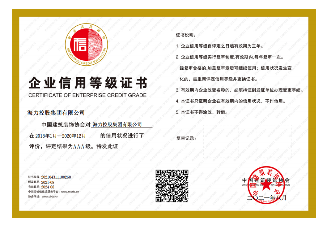 “AAA级信用企业”是全国建筑装饰行业企业主体信用等级评定的最高级别,是企业信用良好、合同履约能力强、经营状况佳、发展前景广阔的权威证明。海力控股集团自成立以来始终将诚信融入企业品牌建设,高度重视安全生产和工程质量,自觉维护市场经营秩序,受到社会各界的广泛认可。