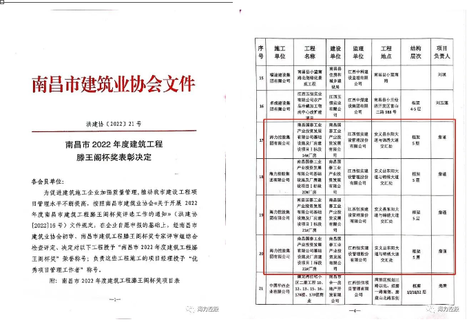 近日,南昌市建筑业协会发布了《南昌市2022年度建筑工程滕王阁杯奖表彰决定》文件,我司承建的“南昌国泰工业产业投资发展有限公司基础设施及厂房建设项目I标段14#、20#、21#、22#厂房”荣获“南昌市2022年度建筑工程滕王阁杯奖”荣誉称号,项目经理詹谨荣获“优秀项目管理工作者”称号。