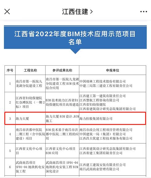 近日,江西省住房和城乡建设厅公布了2022年度BIM技术应用示范项目名单,海力控股集团申报的海力大厦项目荣耀上榜,被评为“2022年度BIM技术应用示范项目”。