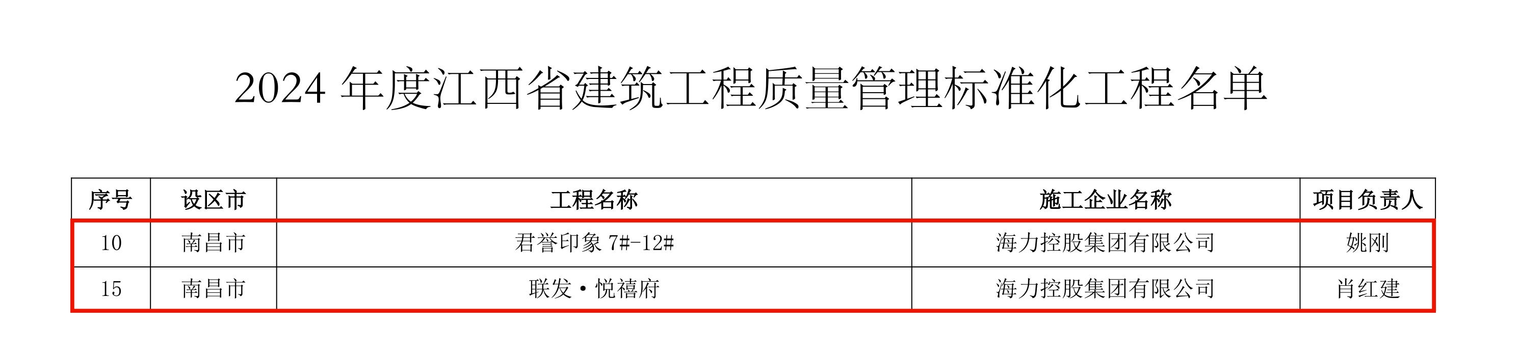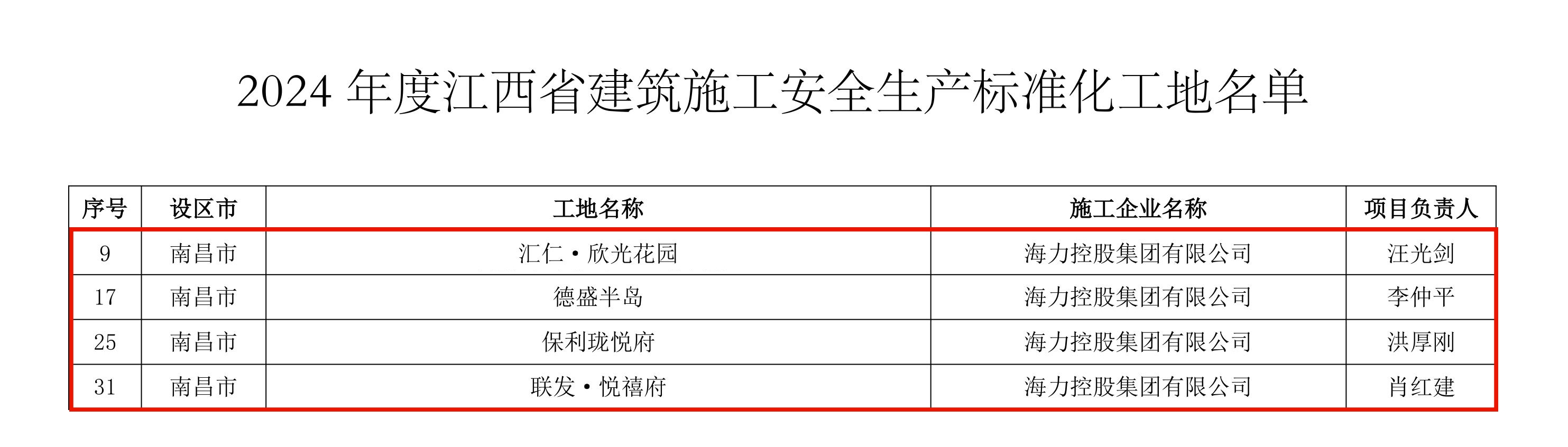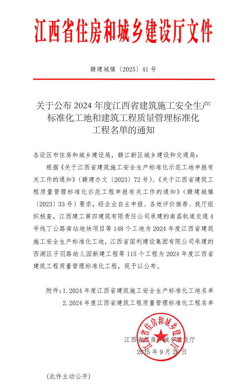 近日,江西省住房和城乡建设厅发布了《关于公布2024年度江西省建筑施工安全生产标准化工地和建筑工程质量管理标准化工程名单的通知》。海力控股集团承建的“汇仁·欣光花园”“德盛半岛”“保利珑悦府”等6个项目凭借卓越的安全管理、精细的质量管控,荣获“建筑施工安全生产标准化工地”和“建筑工程质量管理标准化工程”称号,标志着公司在安全生产与工程质量管理标准化建设领域再获权威认可。